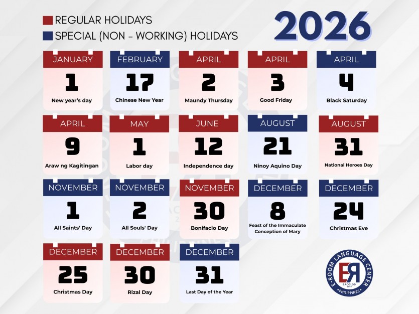 2026년 필리핀 공휴일 안내 페이지 정보 목록 본문 PHILIPPINES PUBLIC HOLIDAY 2026* 휴일에는 수업이 없음을 알려드립니다 이전글2026년 1월 주니어영어캠프 모집 요강 25.10.17 다음글2024년도 학비 인상 안내 25.10.17 댓글 0 댓글목록 등록된 댓글이 없습니다.